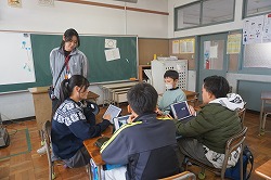 6年1組では、ICT支援員を迎え、旅行のパンフレットづくりを行っていました。子どもたちが旅行会社の社員気分で、世界遺産を旅する人のためのパンフレットを作成しているのだそうです。すてきなパンフレットにするため、試行錯誤を繰り返し、真剣な面持ちでタブレット端末を活用していました。2組・3組も同様な活動を行っています。
