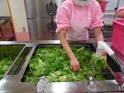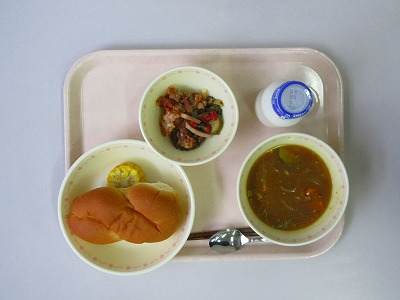 クロスロール、牛乳、野菜と揚げ豚肉のさっぱり和え、カットコーン、夏野菜のカレースープ