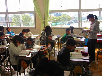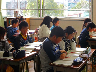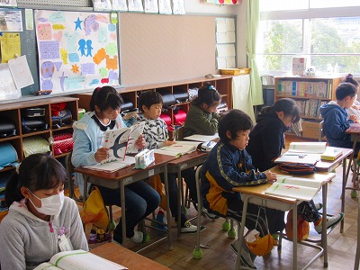 4年生では国語で物語教材の「初雪の降る日」の学習が始まりました。CDラジカセから聞こえる範読を聞きながら、話のあらすじをつかんでいました。不思議な世界にどんどん入っていくところや女の子の気持ちを考えながら読み深めていきます。