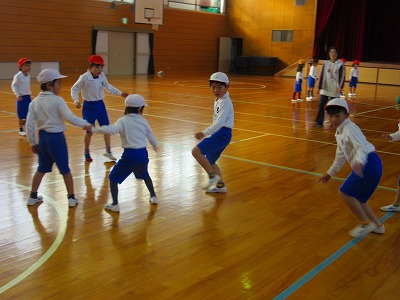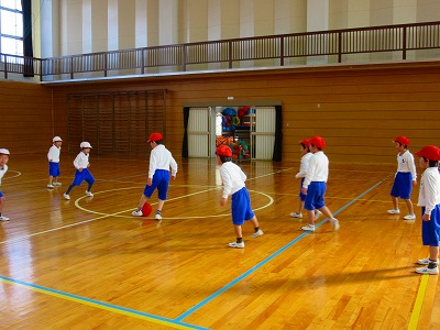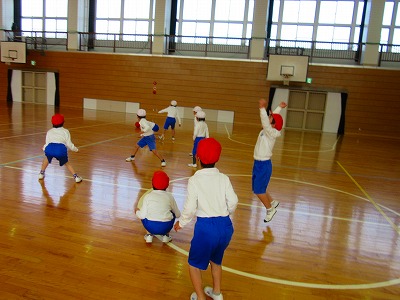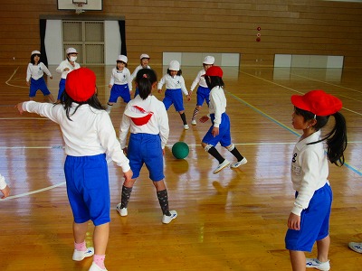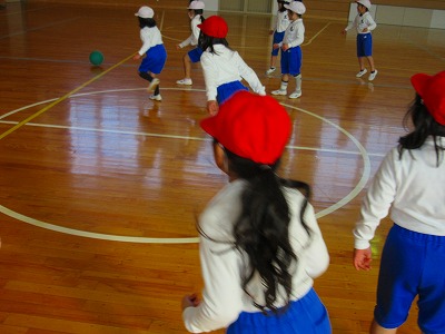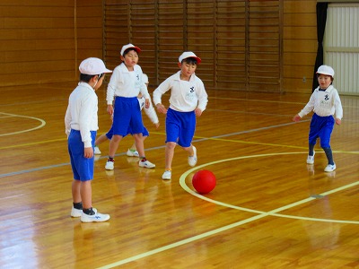 1年生が体育でボールを使ってラインサッカーを楽しんでいました。ラインを越されないように、けられたボールを守って止めます。繰り返すうちに守りのかたちが横並びから、前後にちらばってコースをふさぐ形に変わってきました。