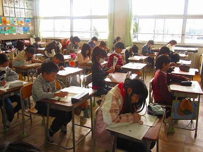 4年生が国語と算数の2科目の学力テストに取り組みました。これまで学校での授業や家庭での自主学習で学んできた成果がしっかり出せるとよいですね。