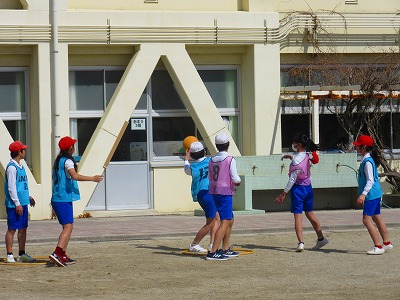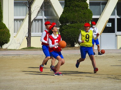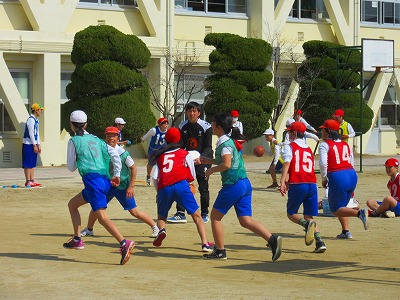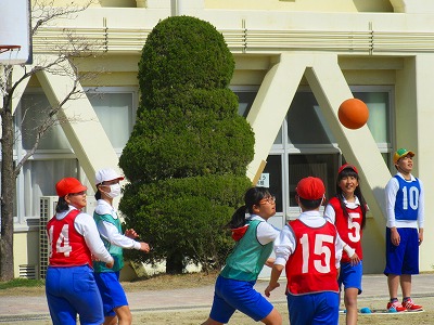6年生が体育でバスケットボールに取り組んでいました。休み時間にはこのコートでよくバスケットボールを楽しんでいた6年生、仲よくゲームを楽しんでいました。