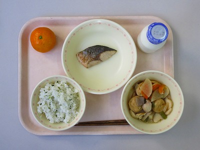 菜飯、牛乳、関東煮、はまちの照り焼き、みかん