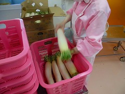 今日は食育の日です。今月はテーマ食材である「大根」をそぼろ煮にしました。大根は大きくわけて、「春大根」と「冬大根」にわけられ、今が旬の「春大根」は、みずみずしいのが特徴です。大根は愛西産のものを購入しました。JAさんと協力をしながら、地産地消で旬のものを子どもたちに食べてもらい、食べて学べる給食づくりを心がけています。