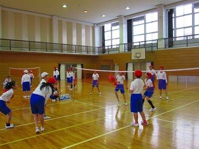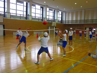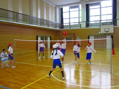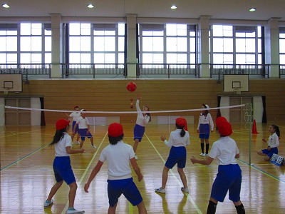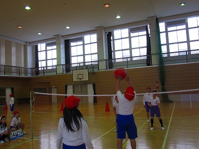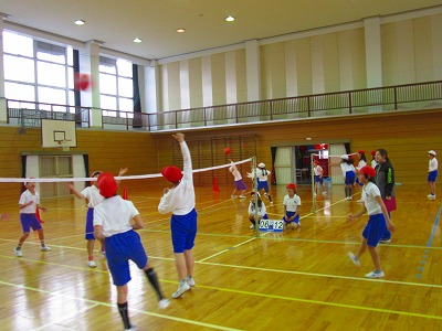 5年生が体育でソフトバレーボールに取り組んでいました。レシーブとトスは一度キャッチしてから、味方へパスを投げてもよいルールでアタックにつなげるので3段攻撃による得点がゲームの随所に見られました。