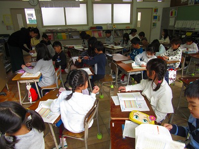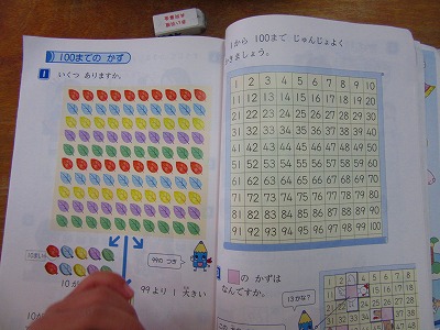 1年生が算数で「100までのかず」を学んでいました。100までの数を数えたり、読んだりしたりするこができ、「一のくらい」と「十のくらい」の意味がわかるように、みんな頑張っていました。