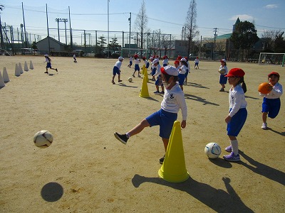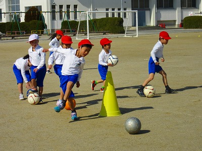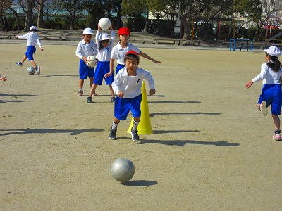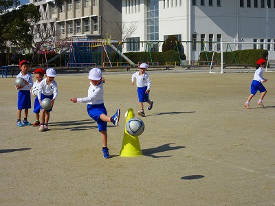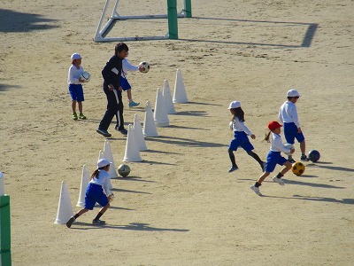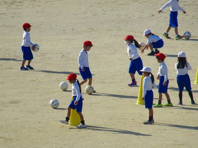 1年生が体育でサッカーボールを使って三角ポストの間をねらって、ボールけり遊びをしていました。けっては自分でボールを追いかけることを繰り返し、いっぱい運動できました。