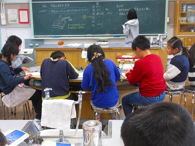 4年生が理科の学習で「空気のあたたまり方」を学んでいました。理科室には線香のにおいが漂っていました。線香を燃やして煙の動きを観察し、「あたためられた空気は、上に行く」という科学的事象を確かめ、まとめていました。