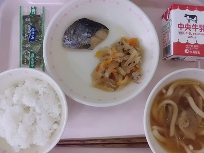 ごはん 牛乳 さわらの照り焼き 豚大根炒め うどん汁 味付けのり