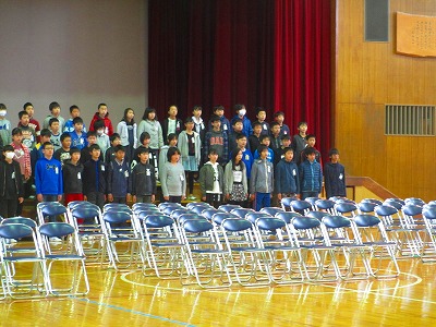 5・6年生が卒業式の合同練習に取り組んでいました。これまで学年の練習は進められていましたが、合同での練習は今日が初めてでした。「別れのことば」の流れが確認されていました。立ったり座ったり、呼びかけ言葉の順番や間を確認できたりと、これまでの部分的な練習がつながってきました。