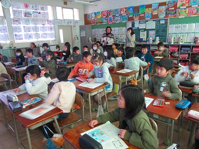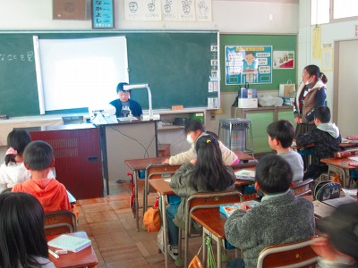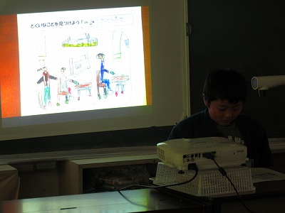 2年生が国語の学習で自分の得意なことをまとめたプリントを投影機で映し出し、紹介をしました。友だちによくわかってもらえるように紹介文を工夫しました。