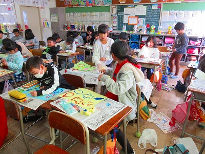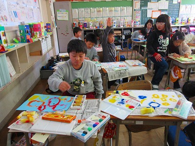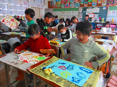 2年生が図画工作でステンシル版画を作成していました。型を作って切り取り、画用紙に型を置き、型のまわりにスポンジを使って色をつけました。最後にパスや絵の具で空いたところに着色して版画を完成させました。
