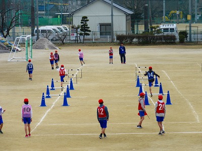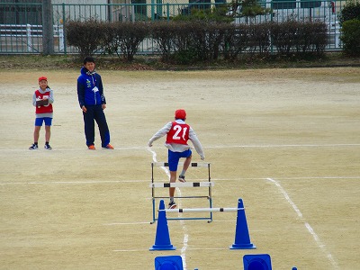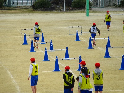 6年生が体育ハードル走に取り組んでいました。フォームが安定し、1台ずつハードルをリズミカルに跳び越えていました。記録が走るたびに良くなっていることが走り方を見て分かりました。