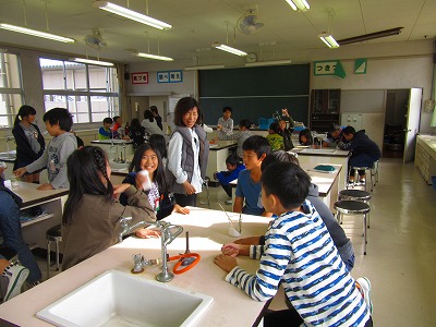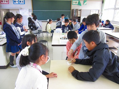 5年生が理科の学習で食塩がどれだけ水にとけるかの実験をしていました。無色透明の水が、塩の分量が多くなるにつれとけなくなり白く濁ってきました。予想した結果と実験での結果との相違点から学びが始まりました。