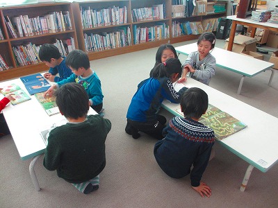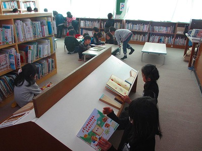1年生がわくわくルームで読書をしていました。みんなで本を探したり、面白い本の紹介をし合ったりすると、読書がより楽しくなりますね。本に親しみながら、図書館の使い方を学びました。