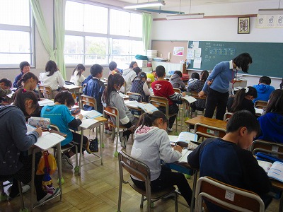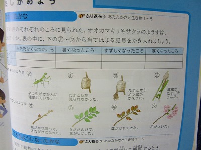 4年生が理科の学習で、オオカマキリとサクラの様子を「あたたかくなったころ」「暑くなったころ」「すずしくなったころ」「寒くなったころ」に分けて、表にまとめていました。詳しく観察することによって季節の変化についての知識を得ていました。