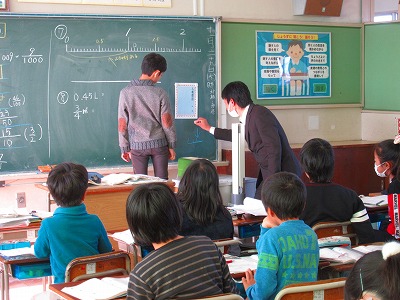 5年生が算数で小数で表された数字の大きさをつかむために、線分図の上で表すとどこにあたるのかを学んでいました。数直線の位置から数値を求めたり、目盛りから値を読みとったりすることを理解しました。