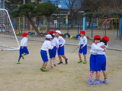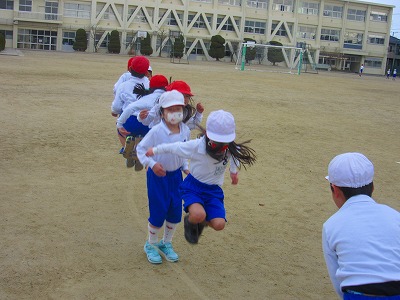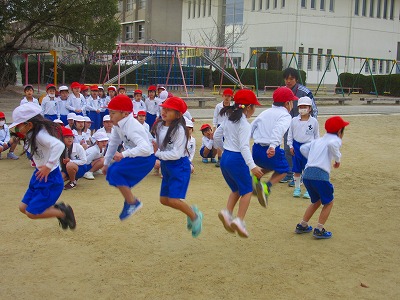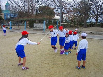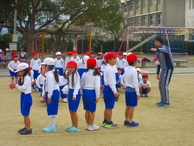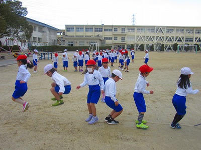 1年生が体育で大なわとびの練習をしていました。大なわとび集会で跳ぶ、全員とびの方法を教師の説明を受けて学んでいました。方法が分かったのであとは、みんなで協力して練習を繰り返していきましょう。