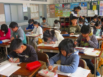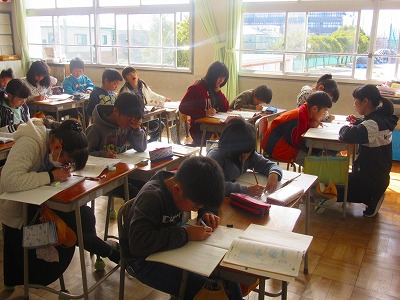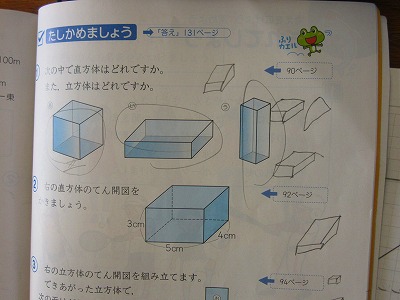 4年生が算数で既習内容の復習をしていました。直方体と立方体の特徴を確認しながら、展開図が正しくかけるよう取り組んでいました。