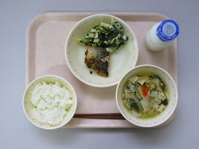 ご飯、牛乳、揚げごまさば、かけ和え、湯葉とめかぶのすまし汁