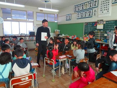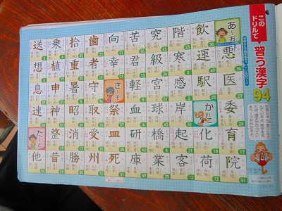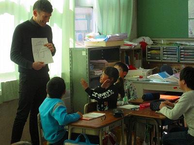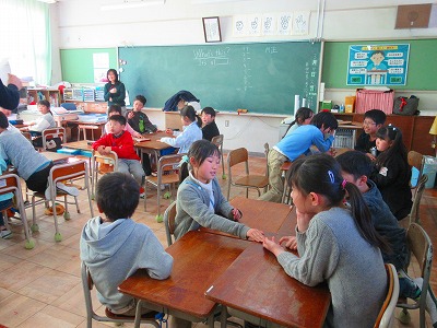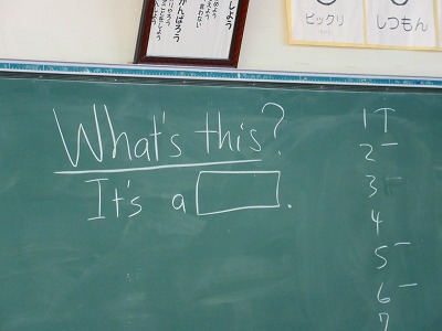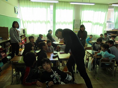 3年生が、英語活動で「What's this?」の会話を楽しんでいました。子どもたちの考えた漢字2字の熟語をマシュー先生が読めるか、読めないかのゲームをしていました。「血行」「半島」「植木」などマシュー先生にとっては難問ばかりでした。どうやら子どもたちは漢字ドリルに書いてある難しそうな熟語を選んでいるようでした。