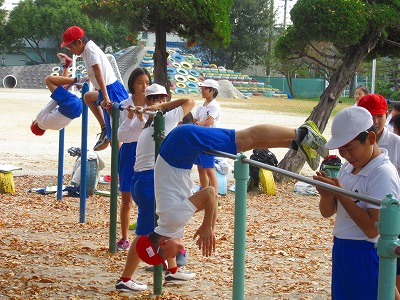 6年生が鉄棒運動に取り組んでいました。できる技を組み合わせて連続技を完成させます。上がり技→回り技→下り技をつないでいきます。練習に力が入っていました。