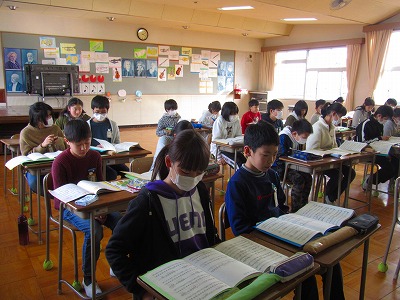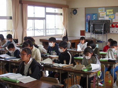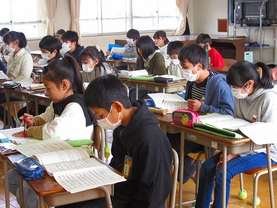 6年生が卒業式で歌う合唱曲「旅立ちの日に」の楽譜を読んでいました。教師から伝えられる注意点をしっかり聞いていました。真剣な表情から、思い出に残る自分たちの卒業式づくりが始まったことを感じました。