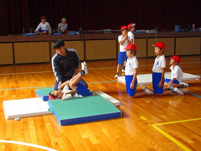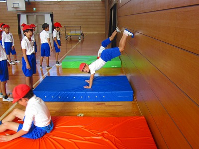 3年生がマット運動に取り組んでいました。壁倒立や三点倒立で頭が下で足が上になる逆さ感覚を高めました。腕の力や腹背筋の力がうまく加わると静止することができます。後転の練習もしました。マットでの後転で後ろに倒れこむ感覚が身に付くと鉄棒での腕立て後転にうまくつながります。