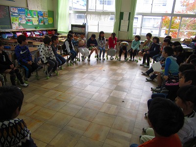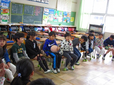 3年生が学級の課題について話し合っていました。円座になりボールを時計回りに回して、ボールが来た時に意見を発表します。意見が頭の中でまとまらない場合は、次の人にボールを回します。同じ内容をみんなで考え合うので、いろいろなアイデアが出ていました。