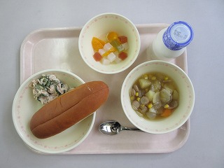 サンドロール、牛乳、ツナサラダ、ポトフ、フルーツカクテル