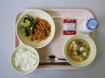 ビビンバ(野菜・肉)、牛乳、中華スープ、ココア牛乳の素