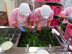 ビビンバは、大人気の献立です。にんにくとねぎ、ごま油で香味を効かせ仕上げたお肉は、味をしっかりつけてあるので、ご飯がすすみます。ほうれん草と大豆もやしの野菜は別の食缶に配缶し、ご飯の上にのせて一緒に食べます。野菜もたくさん食べられる献立です。