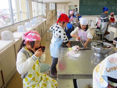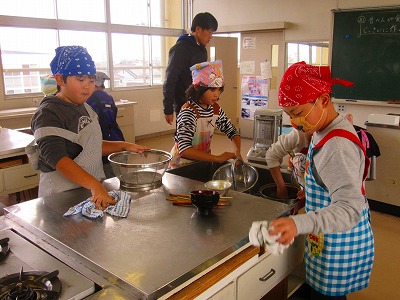 3年生がすいとんづくりを行いました。残念ながらすいとんを食べ終わってしまったところでしたが、グループみんなで協力して片付けをする様子を見ることができました。