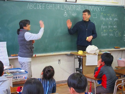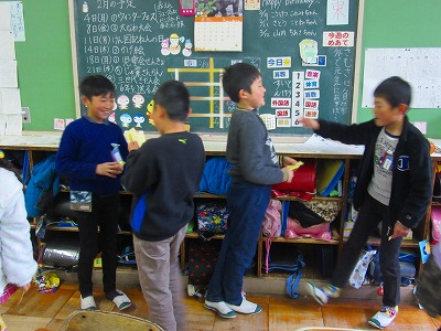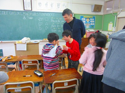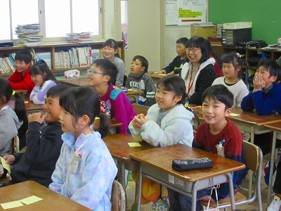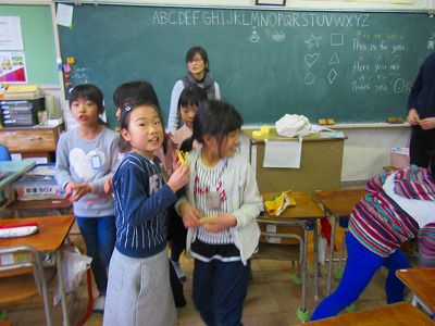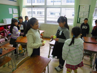 3年生がアルファベットの大文字で自分のイニシャルを書いた紙をもって、自己紹介ゲームを行っていました。やり取りの中で「This is for you.」「Here you are.」「Thank you!」の会話を交わしました。