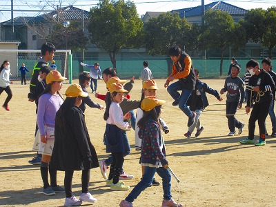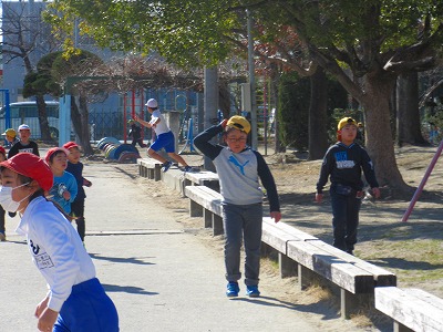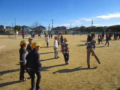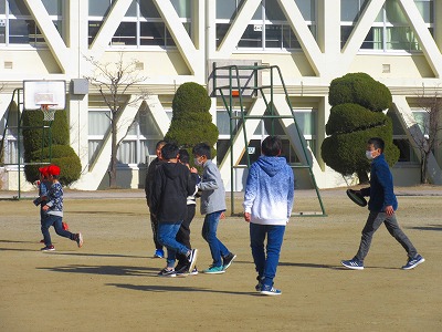 サニータイム、日差しが差すと体がすぐに温まる天気でした。広い運動場の様々な場所で、思い思いに遊んでいる子どもたちでした。