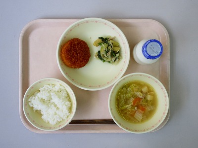 ご飯、牛乳、さつまいもコロッケ、ほうれん草の炒め物、和風しょうがスープ