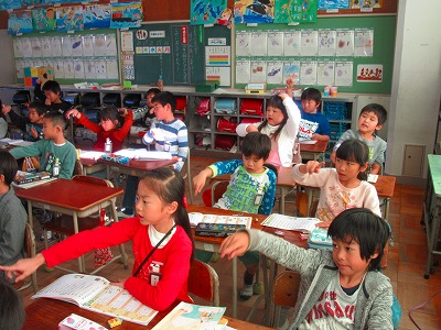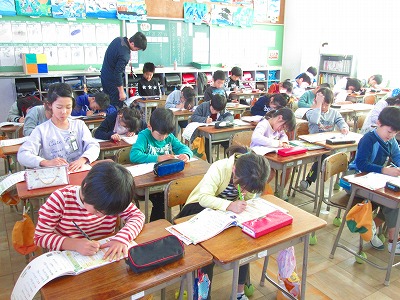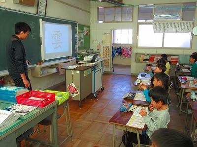 2年生が国語で新しい単元の新出漢字を学んでいました。空書きやなぞり書きを繰り返しました。書き順は黒板に一画一画映し出されていく画像を見てよく分かりましたね。