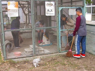 飼育委員会の子たちが、サニータイムに飼育小屋の掃除をしていました。毎日の掃除によって、衛生的できれいな小屋の中で、寒さに負けずウサギは元気に過ごしています。