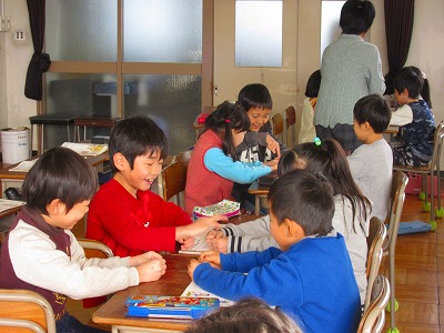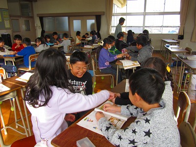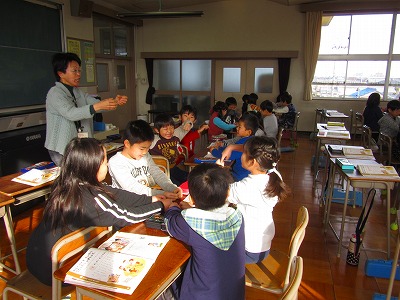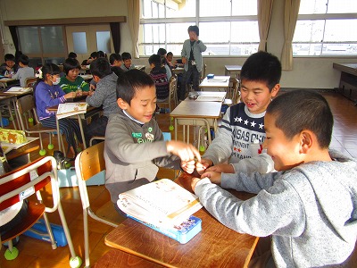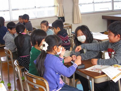 2年生が音楽で、わらべ歌の学習をしました。何人かで輪をつくり、みんな手を軽く握って小さな穴を作り「ずいずいずっころばし」の歌に合わせて順番に指を突っ込んでいきます。わらべ歌の独特のリズムや歌詞などに触れ、子どもたちはその面白さを楽しんでいました。