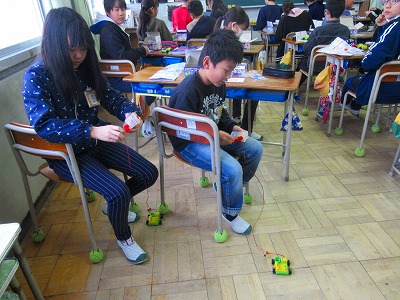 6年生が理科でコイルモータを使ってタイヤをつけた車を走らせていました。電気が流れるように、うまく乾電池やモーターが接続できているかを確認して走らせていました。
