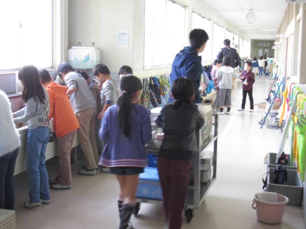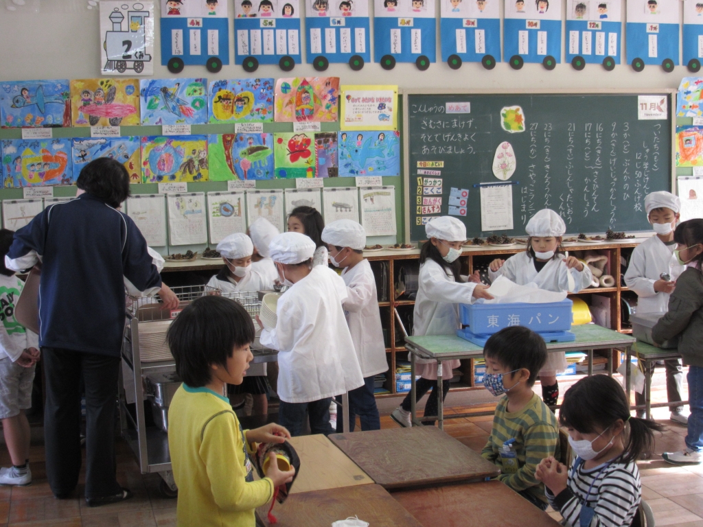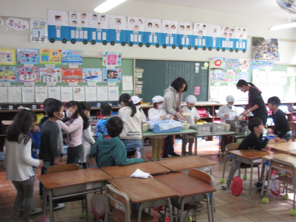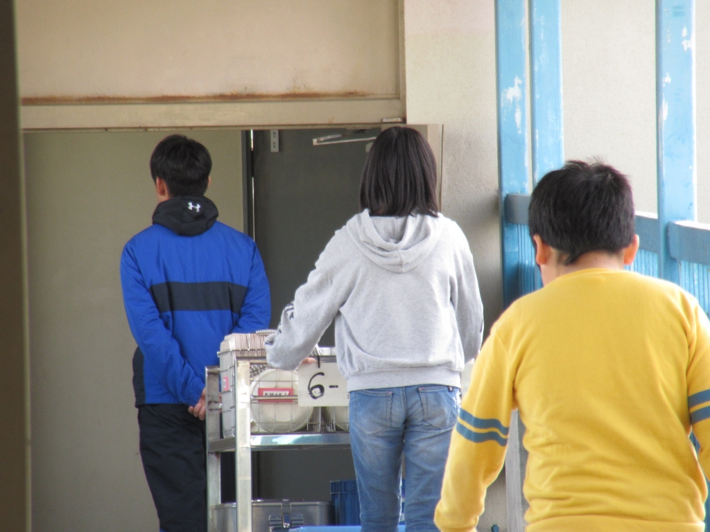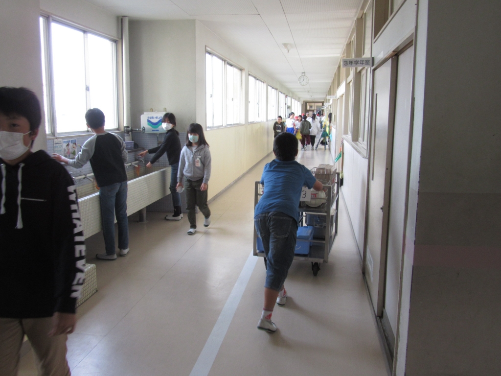 給食の準備の様子です。給食のワゴンを各クラスの当番の子が運んでいました。1年生もすっかり給食の準備に慣れ、給食当番が手際よく配膳していました。