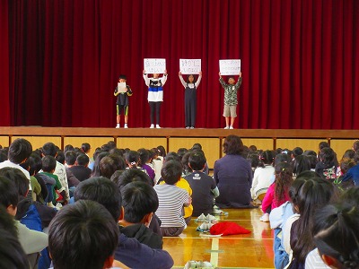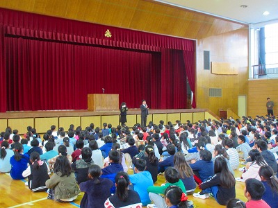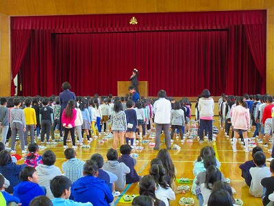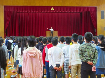 朝礼がありました。転入生の紹介に始まり、合唱練習、校長講話のあとに愛西ライオンズクラブの吉川会長様から、「アイリンブループロジェクト」の話をしていただきました。このプロジェクトは、東日本大震災で亡くなった佐藤愛梨ちゃん(当時6歳)の最後の場所に咲いていたフランス菊を株分けし、多くの方が関わりながら育てることで命の大切さを繋ぎ、防災教育を行う活動です。明日、フランス菊が中庭の花壇に植えられます。大切にお世話をしていきましょう。その後朝礼は放送委員会のクイズ、児童会からの連絡と続き終了しました。
