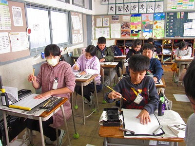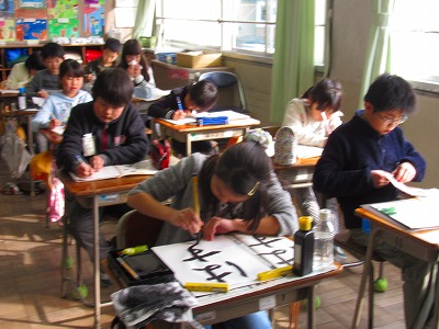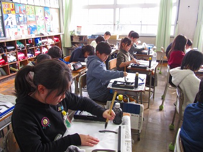 4年生が書写で「はす」の字を書いていました。「は」と「す」にある「結び(線を丸く書いて交差させる)」は、はらい同様に難しい部分です。これがきちんとできると、それだけでも字が上手に見えますね。