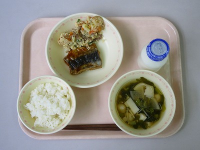 ご飯、牛乳、さんまのかば焼き、卯の花、たまふ汁