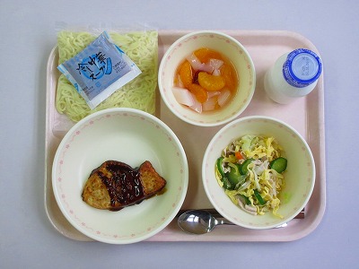 夏の風物詩である冷やし中華の登場です。今日の具は、ロースハムと短冊卵、きゅうり、キャベツ、にんじん、もやしです。たれは麵屋さんが給食の中華麺に合うように考えて作ったたれを使用しますので、ほどよい酸味で食べやすいです。