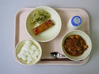 ご飯、牛乳、なす入り麻婆豆腐、春巻き、空心菜のナムル