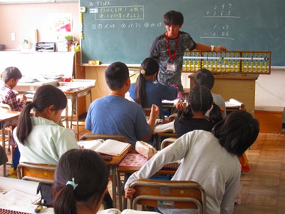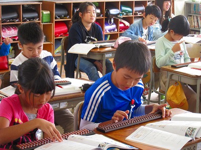 4年生が算数で「そろばん」の学習をしていました。2.47+3.63=?、1.25-0.86=?など小数のたし算・ひき算の答えを求めていました。慣れない手つきで親指と人差し指で玉をはじいていました。玉を払う音がだんだんそろってきました。