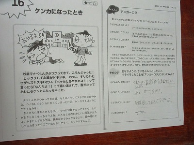 4年生が道徳で校庭でぶつかって転んで、「あやまれよ!」と言ったら、「なんだよ!」と言い返されてけんかになったときの話を聞きました。よりよい解決を求めてアンガーログ(怒りのメモ)という文字にして書き出す方法を学びました。