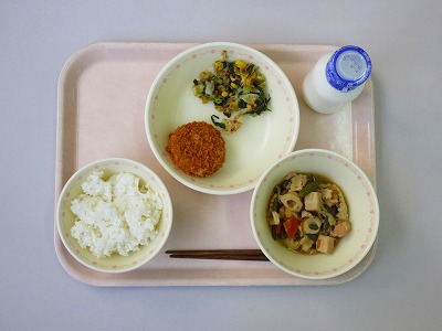 ご飯、牛乳、和風コロッケ、野菜のおかか和え、高野豆腐の含め煮