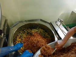 今日の野菜のおかか和えは、ほうれん草、キャベツ、とうもろこしで作りました。かつお節は、スチームコンベクションで加熱してから使用しています。学校給食では、全て加熱をして温度をはかり、提供しています。スチームコンベクションオーブンで加熱することで、香ばしく、おいしいおかか和えに仕上げることができます。
